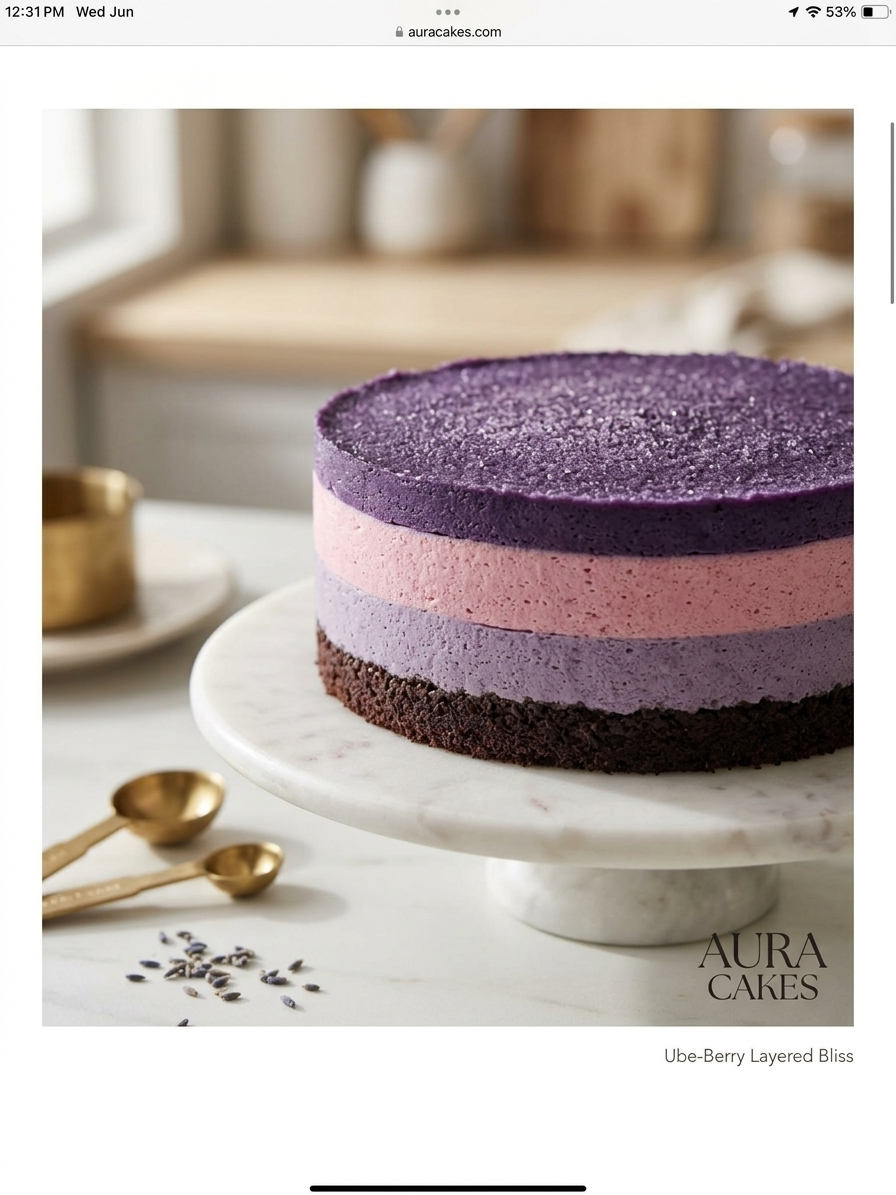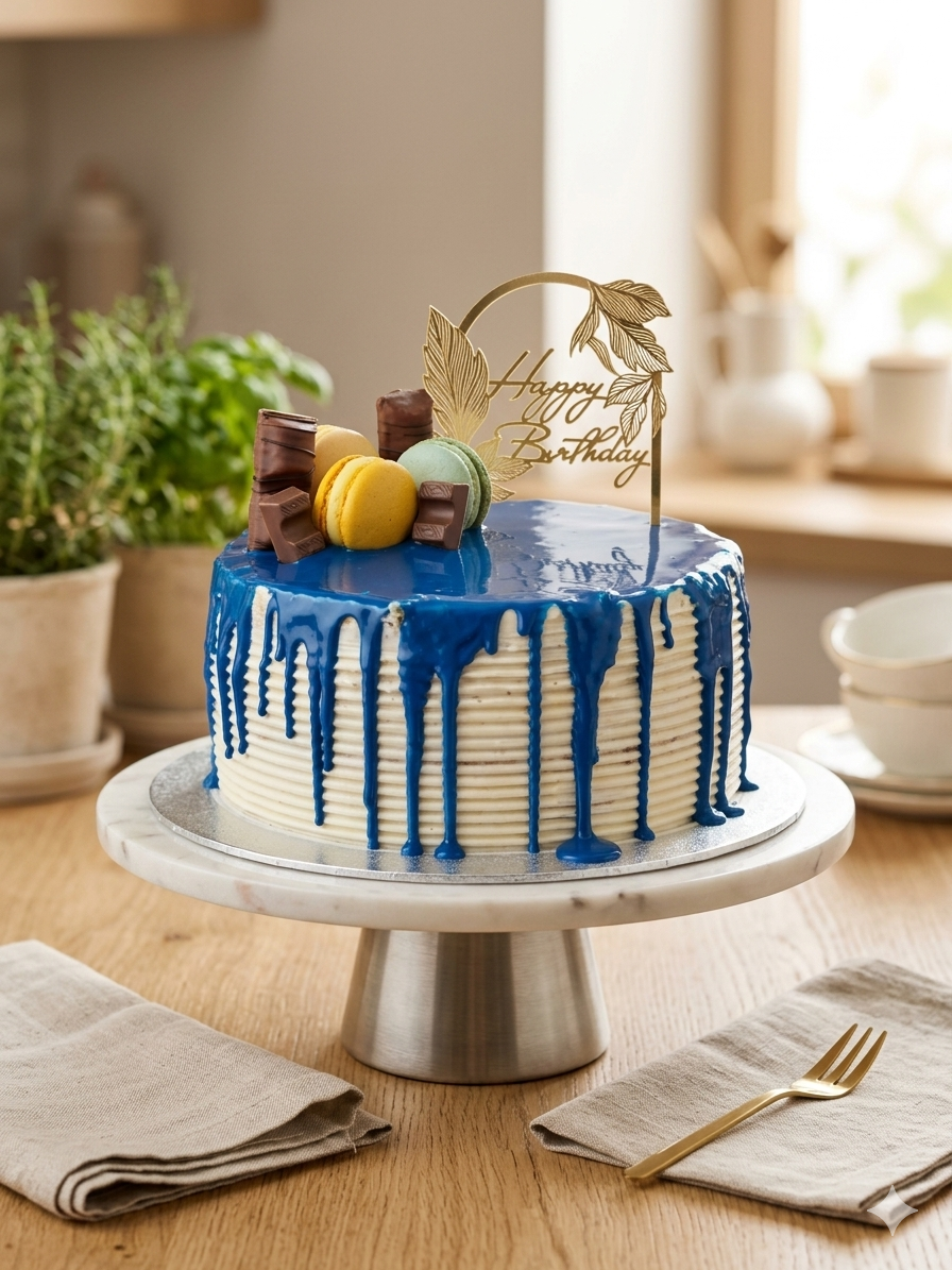 Un tort cu blat pufos de cacao, completat de un mousse fin de afine și o cremă delicată de vanilie. Decorul include un drip elegant de ciocolată neagră, colorat cu albastru, iar exteriorul este acoperit cu cremă de mascarpone, frișcă și un strop de zahăr pudră. Deasupra, tortul strălucește cu macarons colorate și bucățele de ciocolată crocante, oferind un mix perfect de texturi și arome.