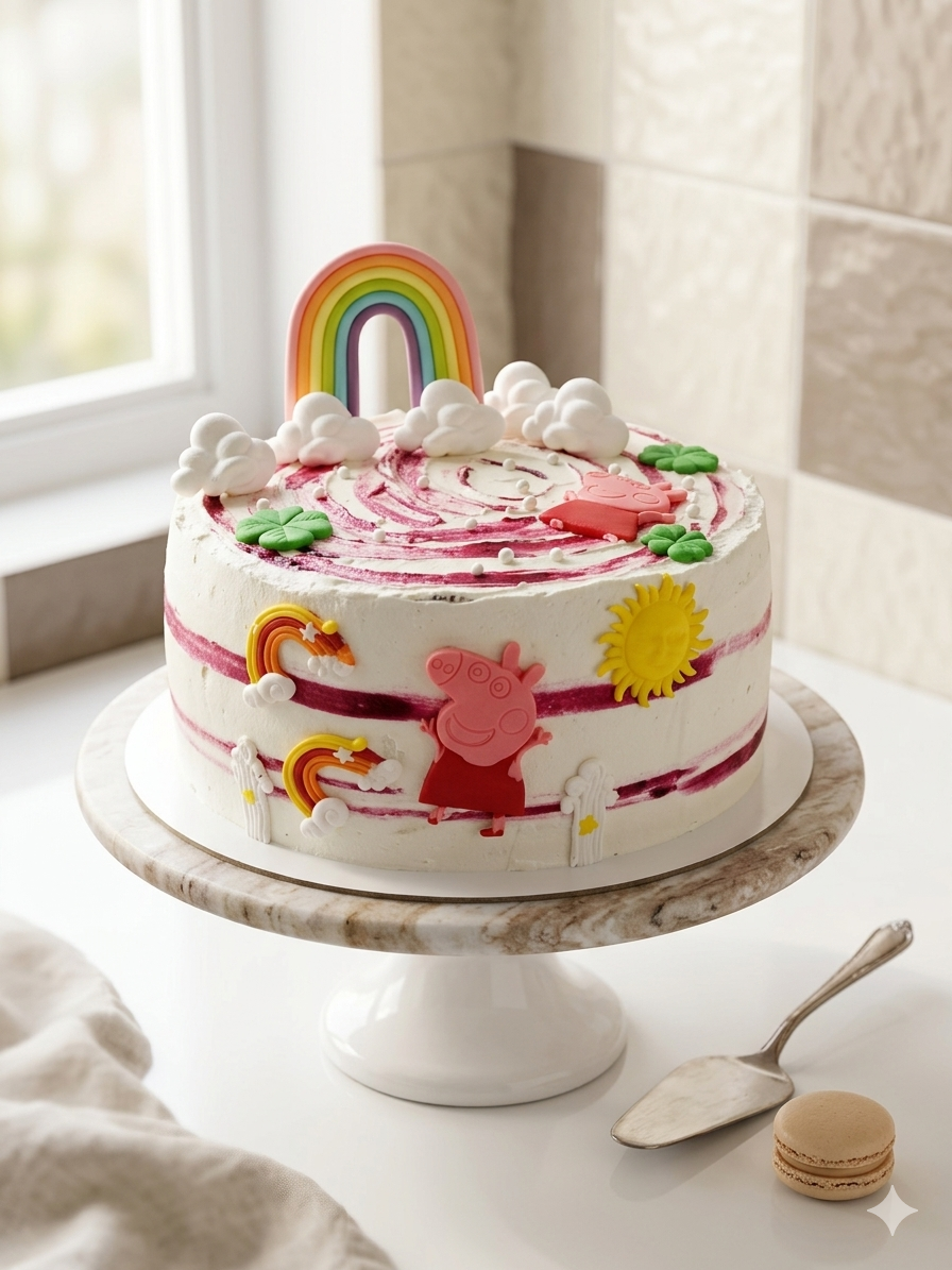 Un tort delicios cu blat pufos de cacao, strat generos de mousse fin de ciocolată și cremă catifelată de vanilie, acoperit cu o cremă delicată de mascarpone și decorat cu frișcă ușoară și un strop de zahăr pudră. Deasupra, figurinele jucăușe Peppa Pig adaugă o notă veselă și jucăușă, perfectă pentru sărbători și momente speciale.