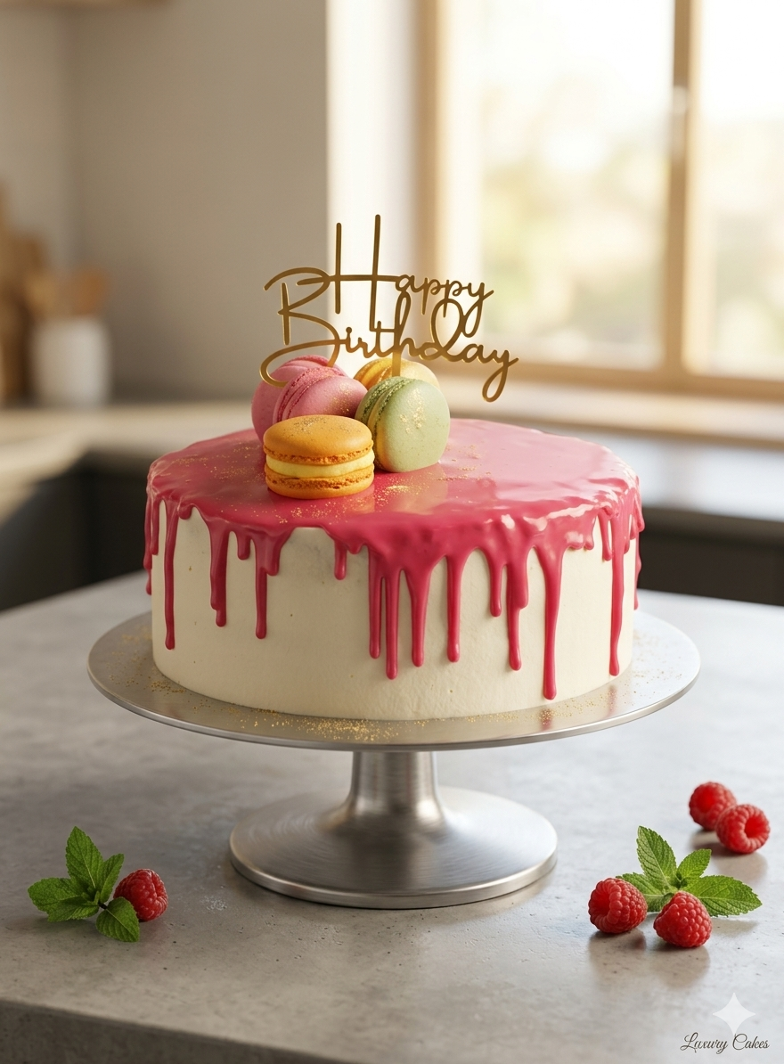 Un tort cu blat fin de cacao, alternând cu straturi generoase de cremă delicată de vanilie și cremă bogată de mascarpone cu Nutella. Decorat cu drip de ciocolată albă roz, acoperit cu cremă de mascarpone și frișcă pufoasă, presărat cu zahăr pudră, iar deasupra sunt macarons, adăugând un strop de culoare și rafinament.