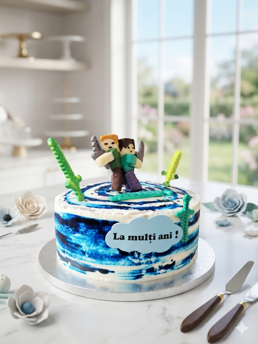 Un tort spectaculos pentru iubitorii de Minecraft! Blatul bogat și umed de cacao se îmbină perfect cu un ganache fin de ciocolată, iar crema de mascarpone cu Nutella adaugă un strat decadent și cremos. Tortul este acoperit cu cremă delicată de mascarpone și decorat cu frișcă pufoasă și zahăr pudră, iar figurinele Minecraft îi oferă un aspect jucăuș și personalizat, perfect pentru petreceri tematice.
